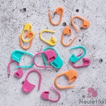 Nämä silmukkamerkit sopivat täydellisesti kerroksen vaihtumiskohdan merkitsemiseen, lisäysten ja kavennusten seuraamiseen sekä kuvioneuleiden apuvälineeksi. Lukittava rakenne estää merkkien putoamisen ja tekee käytöstä sujuvaa myös kesken neulonnan.